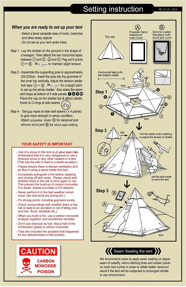 Il est équipé d’une trappe de cheminée pour pouvoir utiliser le tipi avec un poêle à bois. Un velcro « Oxford Patch » permet au tuyau de sortir de l’abri sans faire fondre le tissu environnant. Il est cependant nécessaire d’utiliser un collier thermique pour faire le tour du conduit de cheminée afin de protéger le patch Oxford et le tissu. Le poêle à bois n’est pas fourni avec l’abri. Vous devez utiliser votre propre solution. Si vous n’utilisez pas de poêle à bois, un patch de protection permet de fermer hermétiquement la trappe de la cheminée.